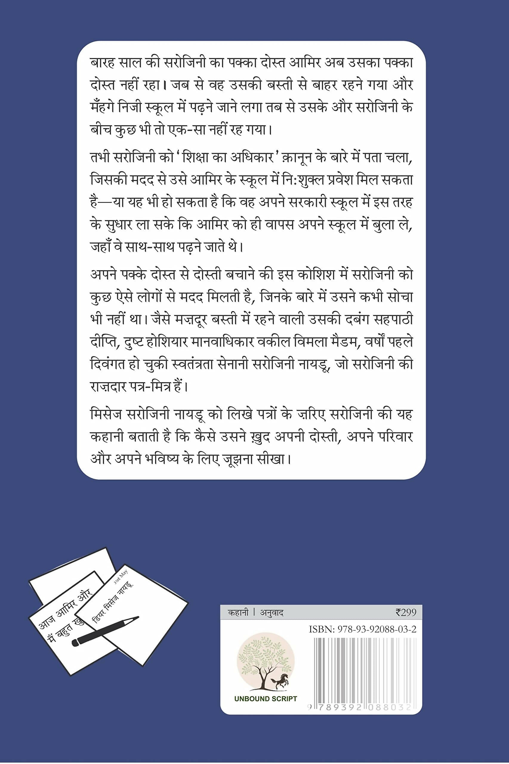 बारह साल की सरोजिनी का पक्का दोस्त आमिर अब उसका पक्का दोस्त नहीं रहा. जब से वह उसकी बस्ती से बाहर रहने गया और मँहगे निजी स्कूल में पढ़ने जाने लगा तब से उसके और सरोजिनी के बीच कुछ भी तो एक-सा नहीं रह गया. तभी सरोजिनी को ‘शिक्षा का अधिकार’ क़ानून के बारे में पता चला, जिसकी मदद से उसे आमिर के स्कूल में निःशुक्ल प्रवेश मिल सकता है- या यह भी हो सकता है कि वह अपने सरकारी स्कूल में इस तरह के सुधार ला सके कि आमिर को ही वापस अपने स्कूल में बुला ले, जहाँ वे साथ-साथ पढ़ने जाते थे. अपने पक्के दोस्त से दोस्ती बचाने की इस कोशिश में सरोजिनी को कुछ ऐसे लोगों से मदद मिलती है, जिनके बारे में उसने कभी सोचा भी नहीं था. जैसे मज़दूर बस्ती में रहने वाली उसकी दबंग सहपाठी दीप्ति, दुष्ट होशियार मानवाधिकार वकील विमला मैडम, वर्षों पहले दिवंगत हो चुकी स्वतंत्रता सेनानी सरोजिनी नायडू, जो सरोजिनी की राज़दार पत्र-मित्र हैं. मिसेज सरोजिनी नायडू को लिखे पत्रों के ज़रिए सरोजिनी की यह कहानी बताती है कि कैसे उसने ख़ुद अपनी दोस्ती, अपने परिवार और अपने भविष्य के लिए जूझना सीखा.