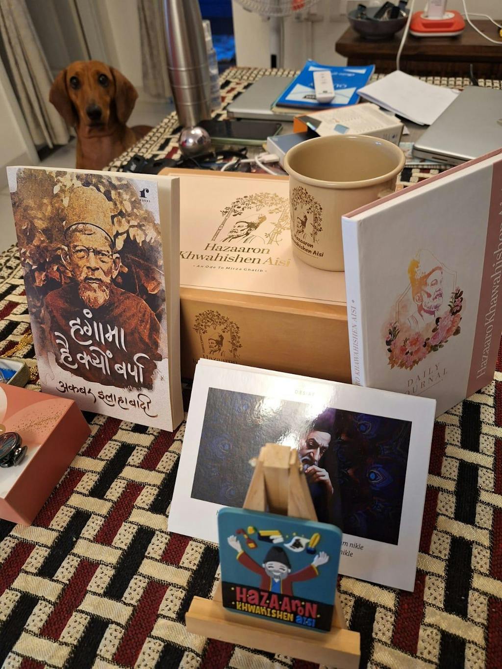 Introducing the 'Hazaaron Khwahishen Aisi' Desire Box, an ode to Mirza Ghalib with a delightful collection of aesthetically curated products inspired by Ghalib's outlook on human desires. Inside, you'll find an array of items tailored to ignite your aspirations, including beautifully crafted postcards to share heartfelt messages, a charming journal to pen down your thoughts & life, a stylish mug for cosy moments of reflection over coffee, and a captivating fridge magnet to remind you of infinite possibilities. The 'Hazaaron Khwahishen Aisi' Desire Box is a perfect present for a loved one and a lover of Ghalib's shayari. This box is brimming with inspiration and encouragement for those chasing their dreams.