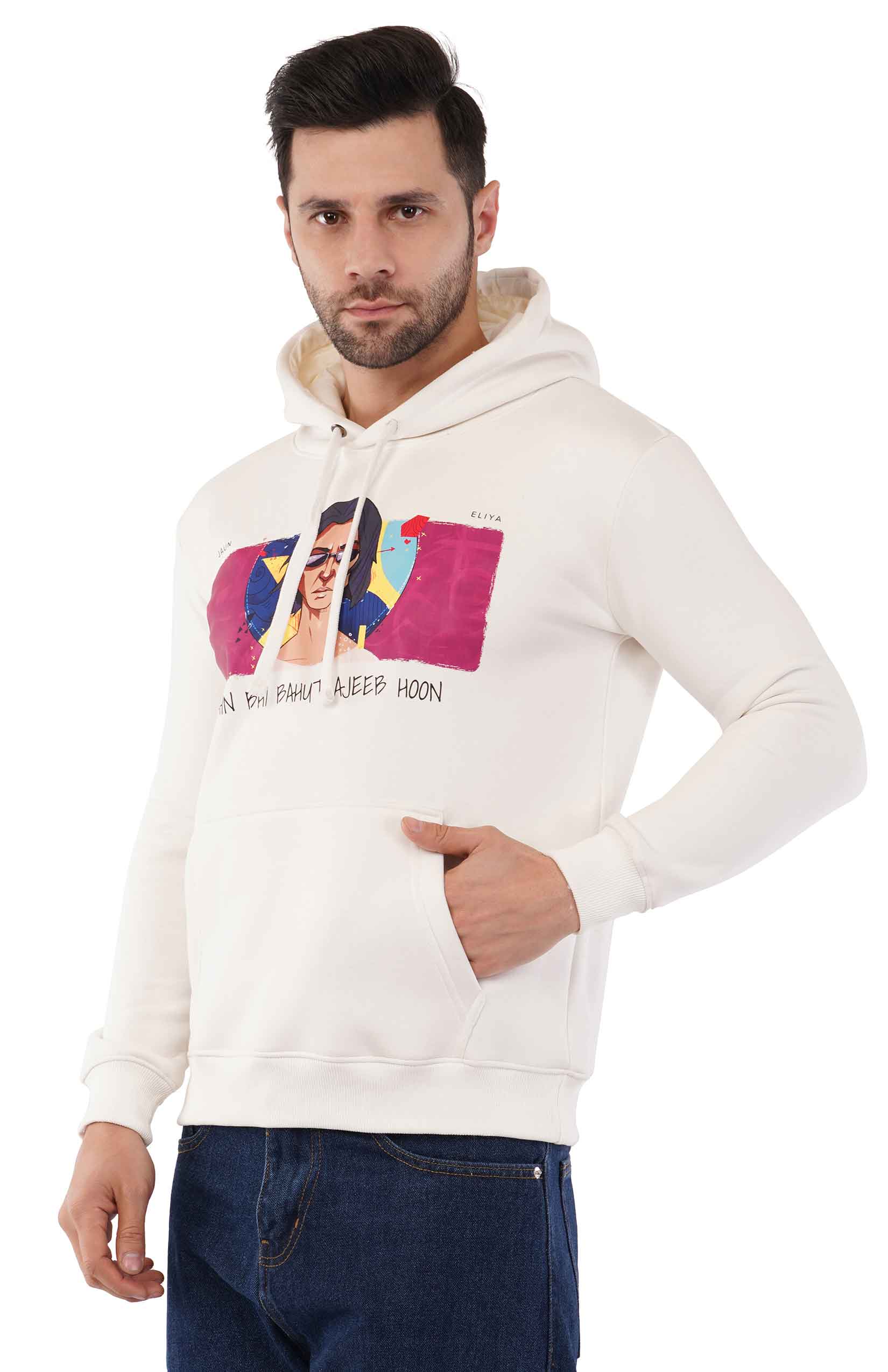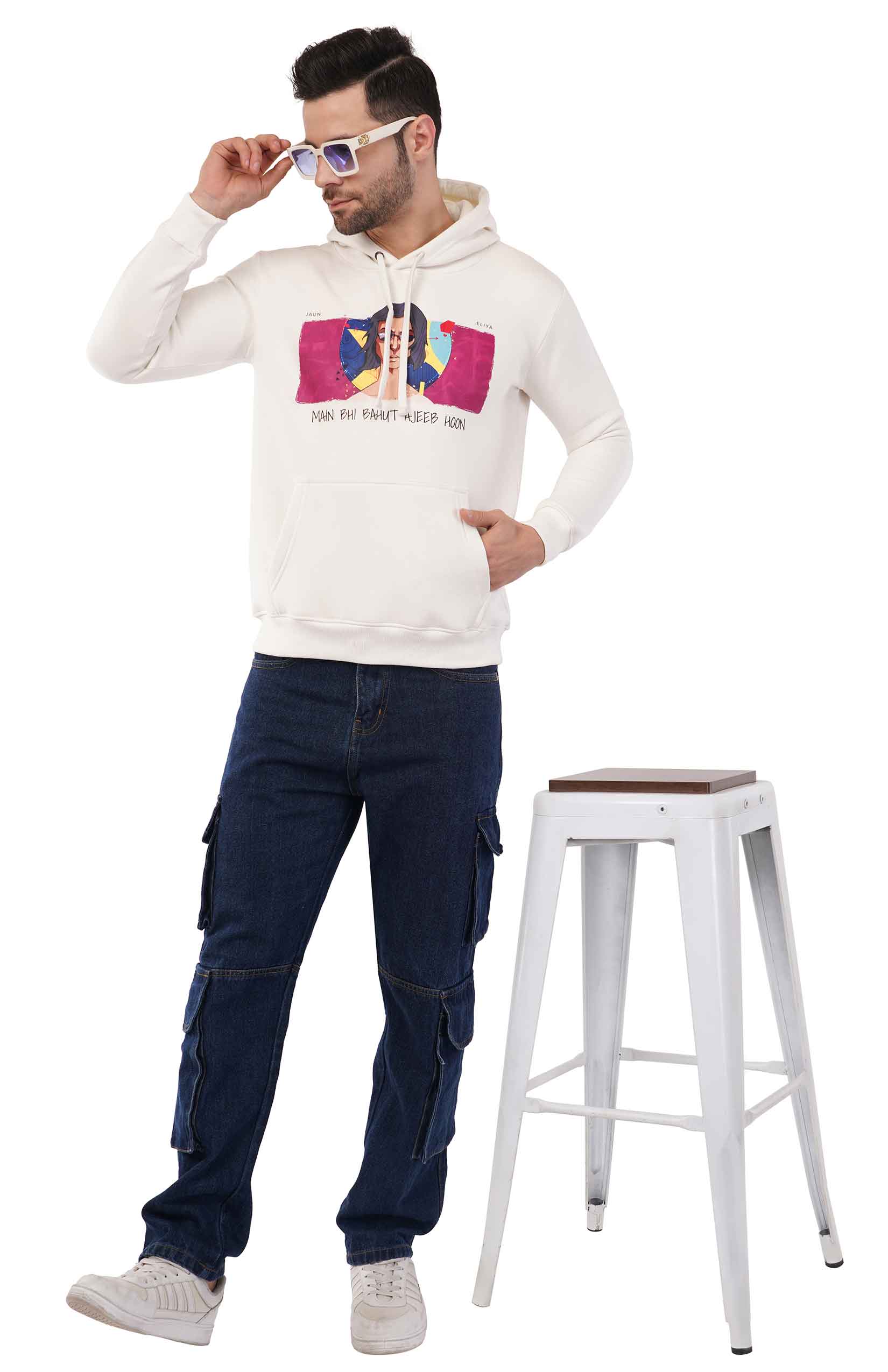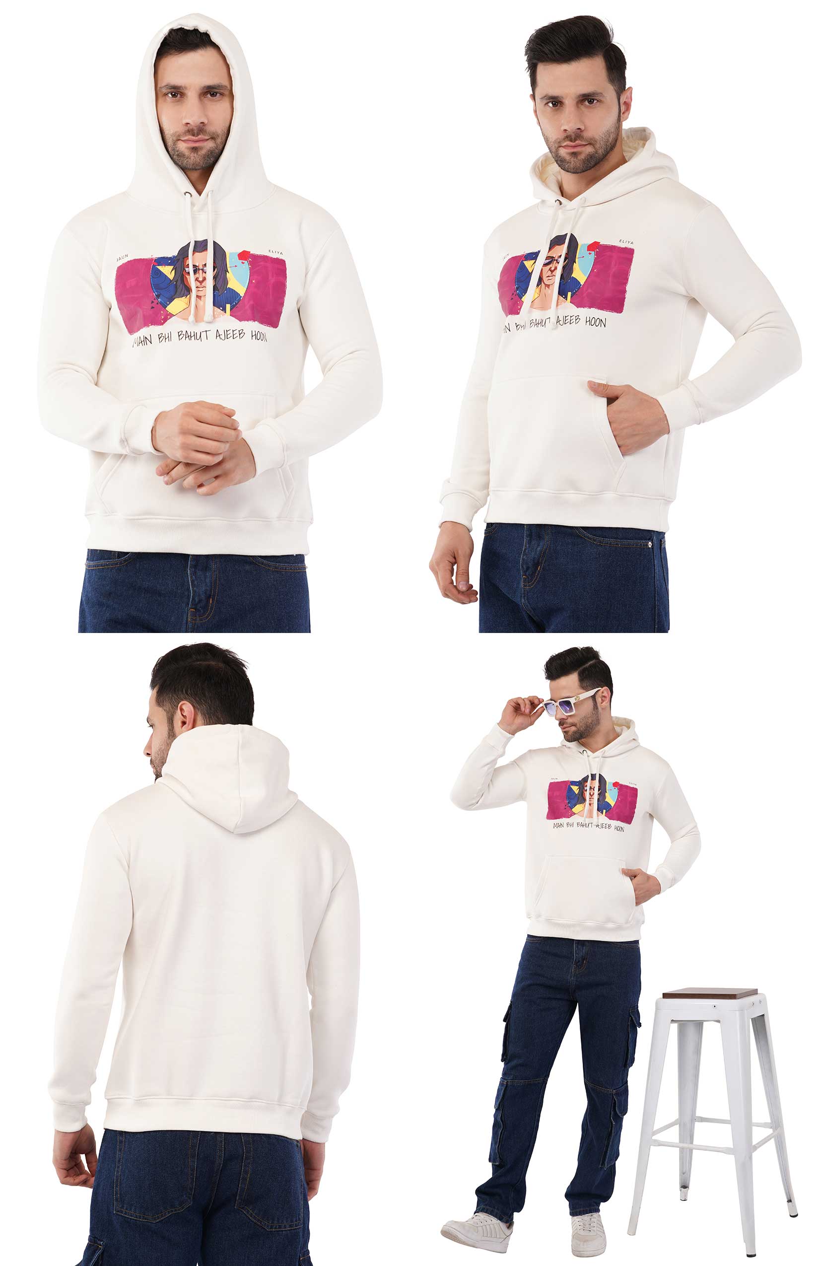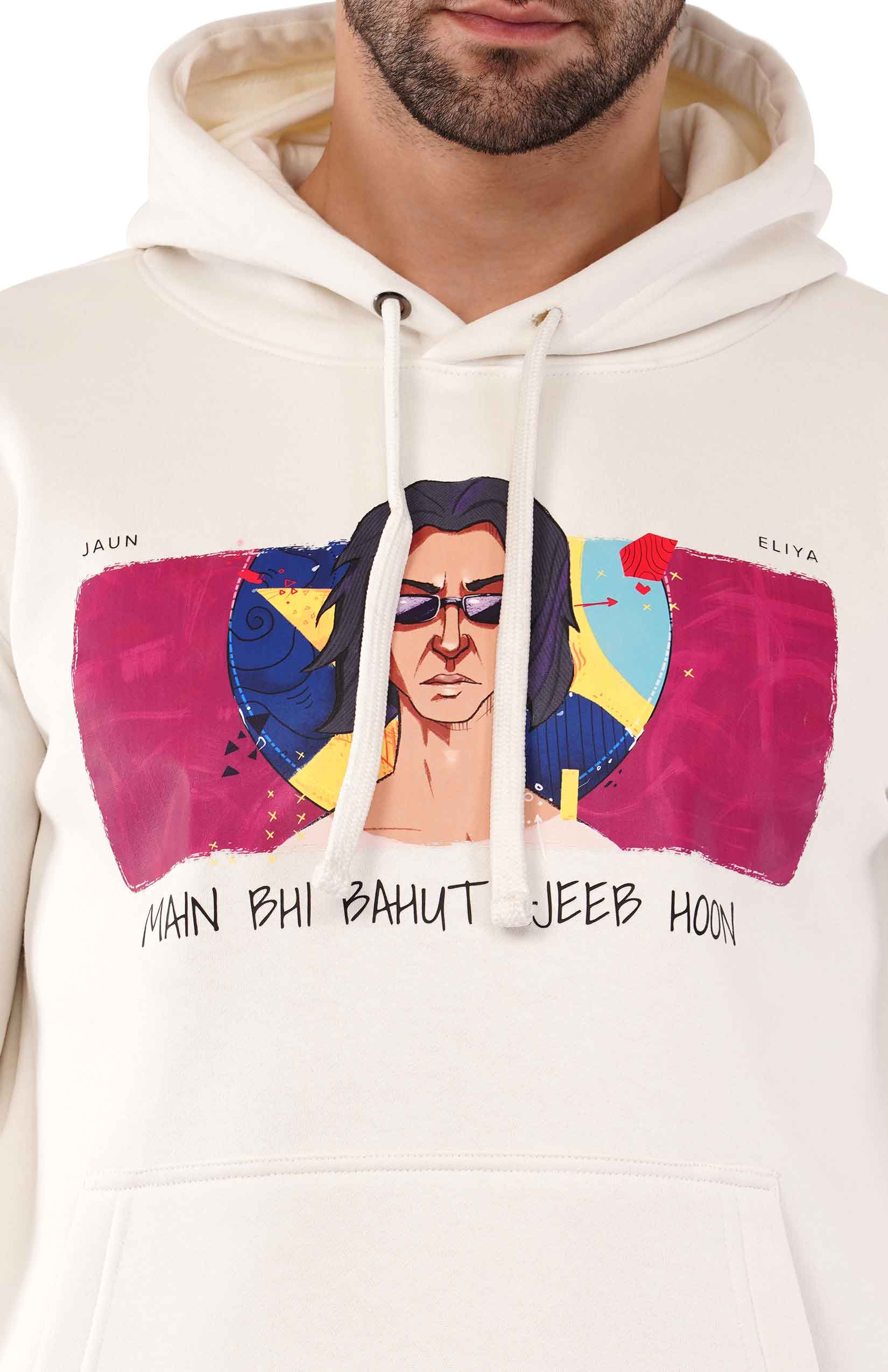 Elevate your style with this off-white hoodie featuring an exclusive graphic inspired by the iconic Jaun Elia. The bold artwork and the evocative line, "Main Bhi Bohat Ajeeb Hoon," make this hoodie a statement piece for lovers of poetry and individuality.
