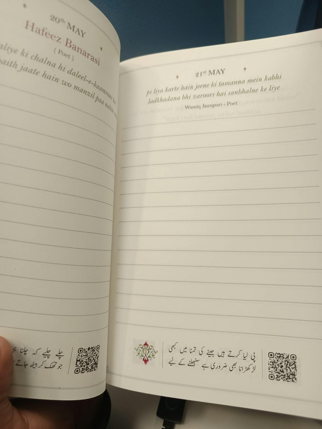 With ample space for daily notes, the diary supports planning, journaling, and personal reflections. QR codes on select pages link to Rekhta.org for deeper literary exploration.