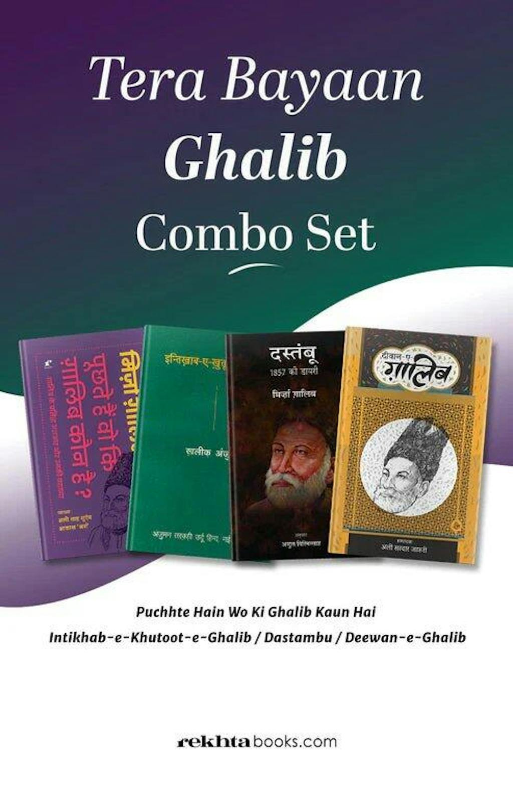 Introducing the "Tera Bayaan Ghalib Book Combo Set," a literary treasure trove that delves deep into the world of the legendary poet, Mirza Ghalib. This captivating collection features four exquisite volumes, each offering a unique glimpse into the brilliance of Ghalib's poetic genius.